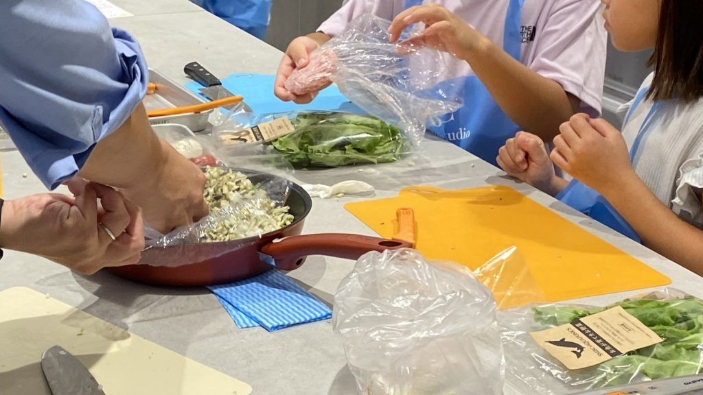 子どもたちはアクアポニックスで育てられたサラダ菜を収穫し、その後収穫した野菜を使って親子でタコライス作りに挑戦しました。